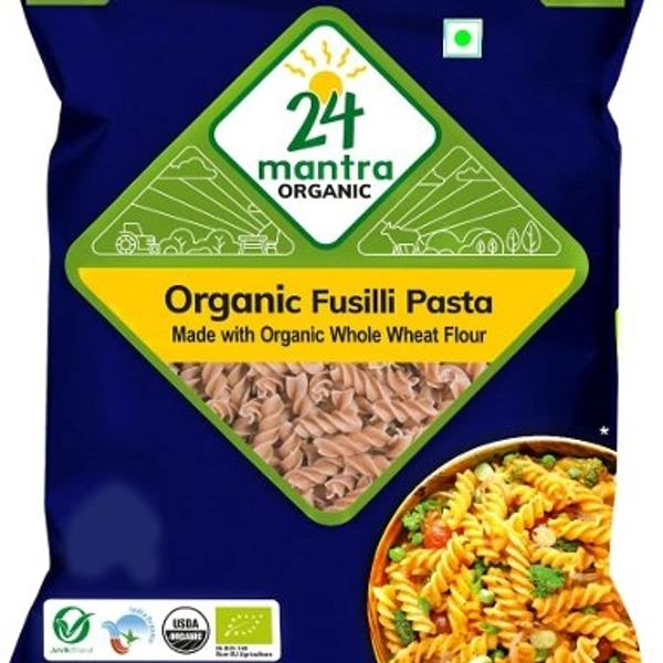24 Mantra Organic fusili pasta is 100% organic. Our pasta is made from the finest quality ingredients (whole wheat atta) sourced from certified organic farms across India. As our fusilli pasta is made only from whole wheat, it is loaded with protein and fibre content and makes for a fulfilling meal.