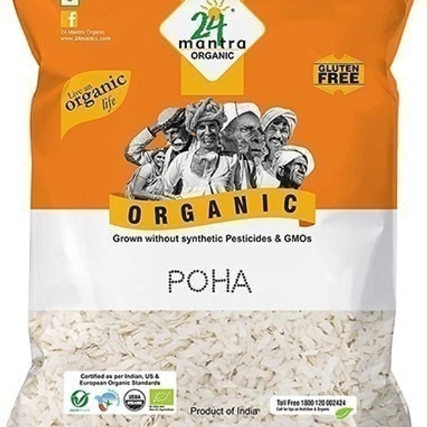 Flattened rice is also called Poha or Atukulu or A val or Flattened rice. Poha, as it is called in India, has relatively higher nutritional content than white rice due to the presence of the aleurone layer. Poha is very convenient and ready to use the product. 24 Mantra Organic Poha or Flattened Rice/Aval /Atukuluhas no bleaching agent or whitening agent added to it. And it is not the thin paper poha variety. Features - Our Organic Poha (Flattened Rice/Aval/Atukulu) is 100 % Organic