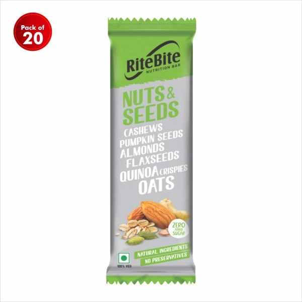 Ritebite Nuts & Seeds Breakfast & Nutrition Bar is a healthy lifestyle choice that makes snacking healthy and tasty. It is a wholesome nutrition bar with the goodness of natural ingredients like cashews, almonds, pumpkin, flax seeds and quinoa crispies. The Ritebite nutrition bar contains no added preservatives and no added sugar. It is a valuable source of energy, proteins and calcium.